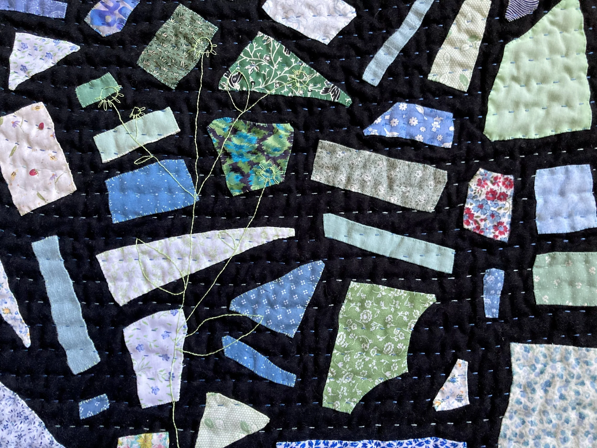 I combine appliqué and embroidery, running stitch and hand-ties, scraps and traditional quilt blocks while drawing inspiration from traditional quilt patterns, tile and crazy quilts, mixed-media art, and poetry. I collage materials and techniques together, creating quilts that document, reflect on, and celebrate all that fills our lives.