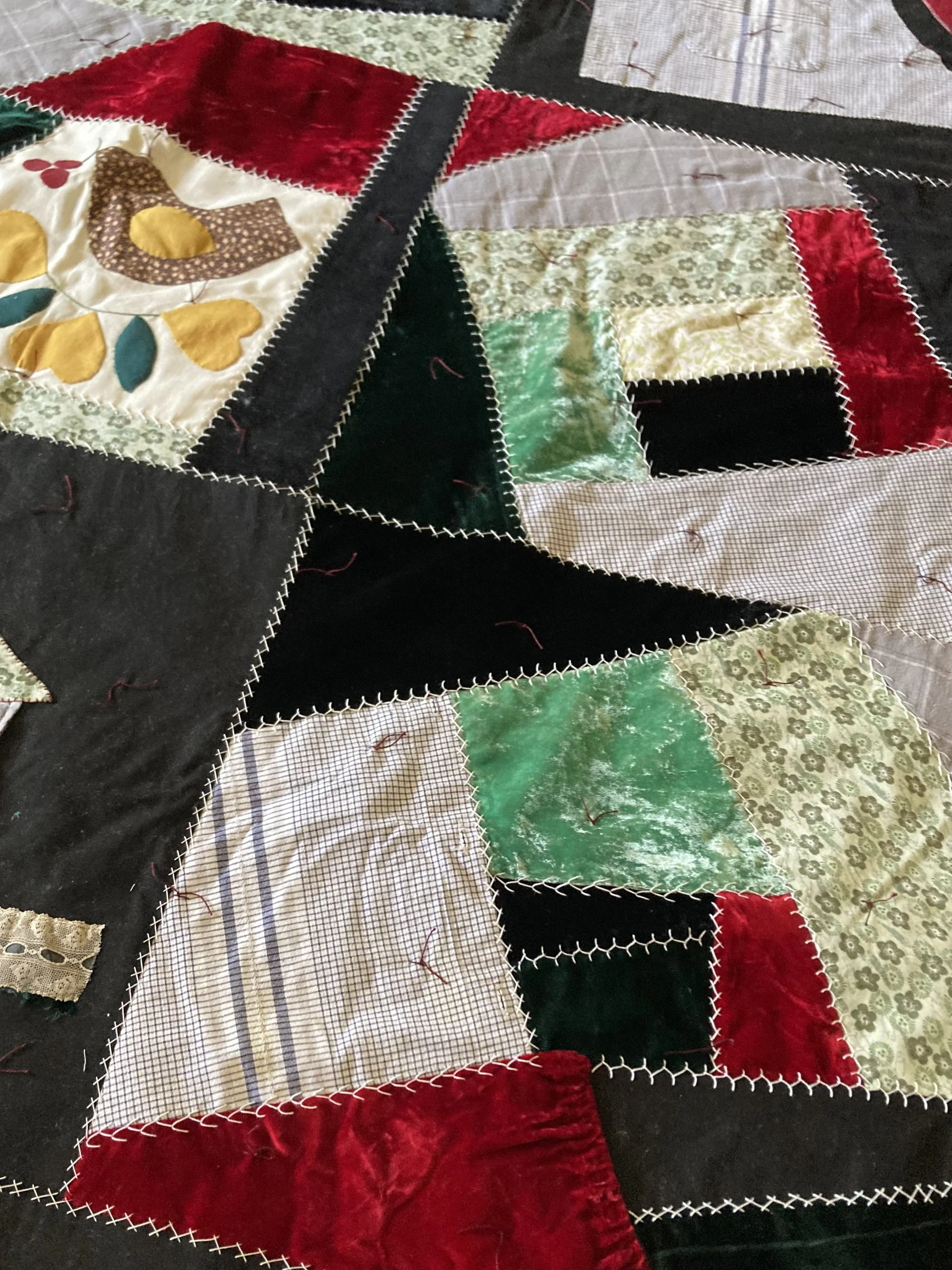 machine-pieced crazy quilt blocks. hand-embroidery. hand-tied.