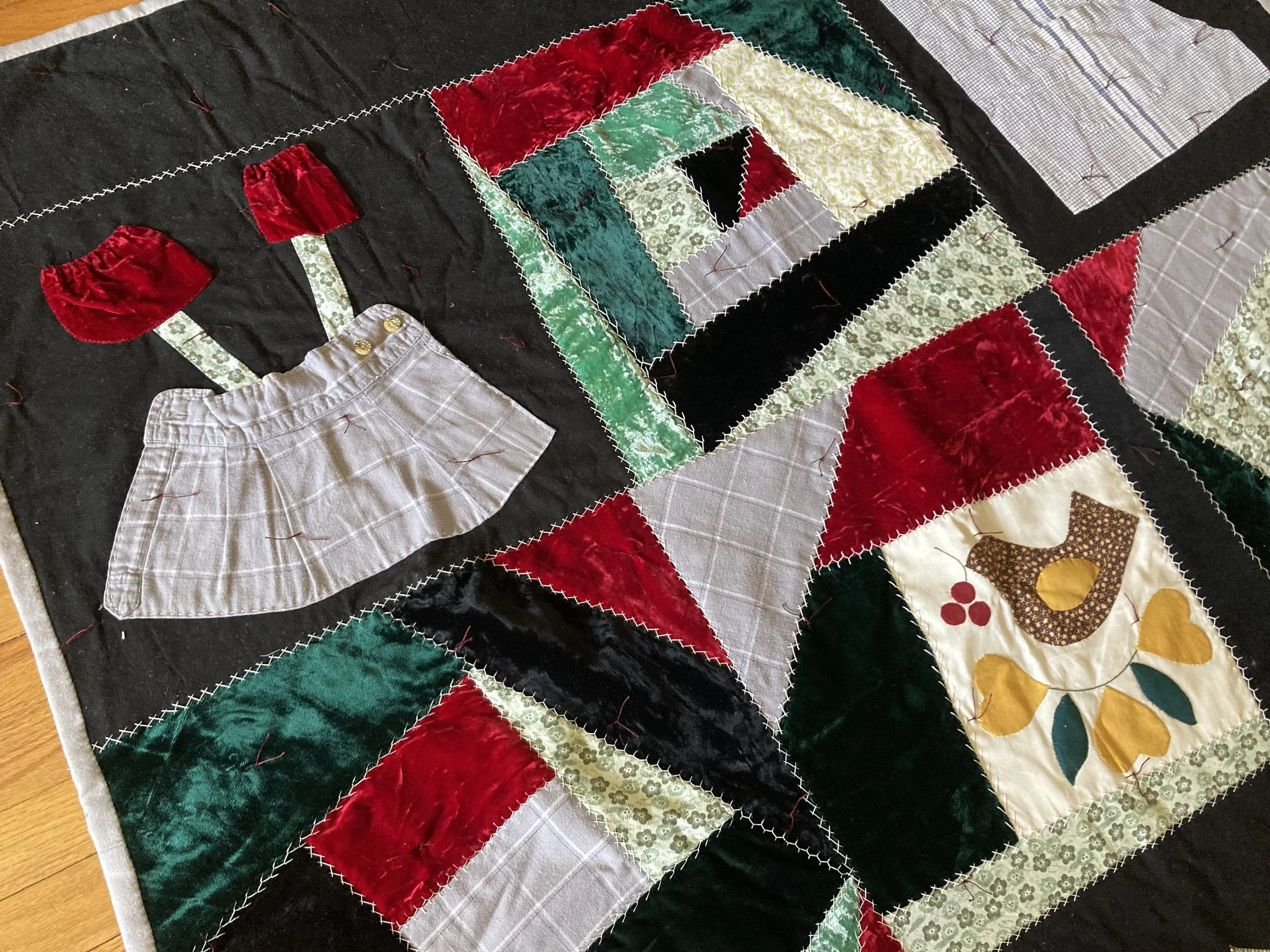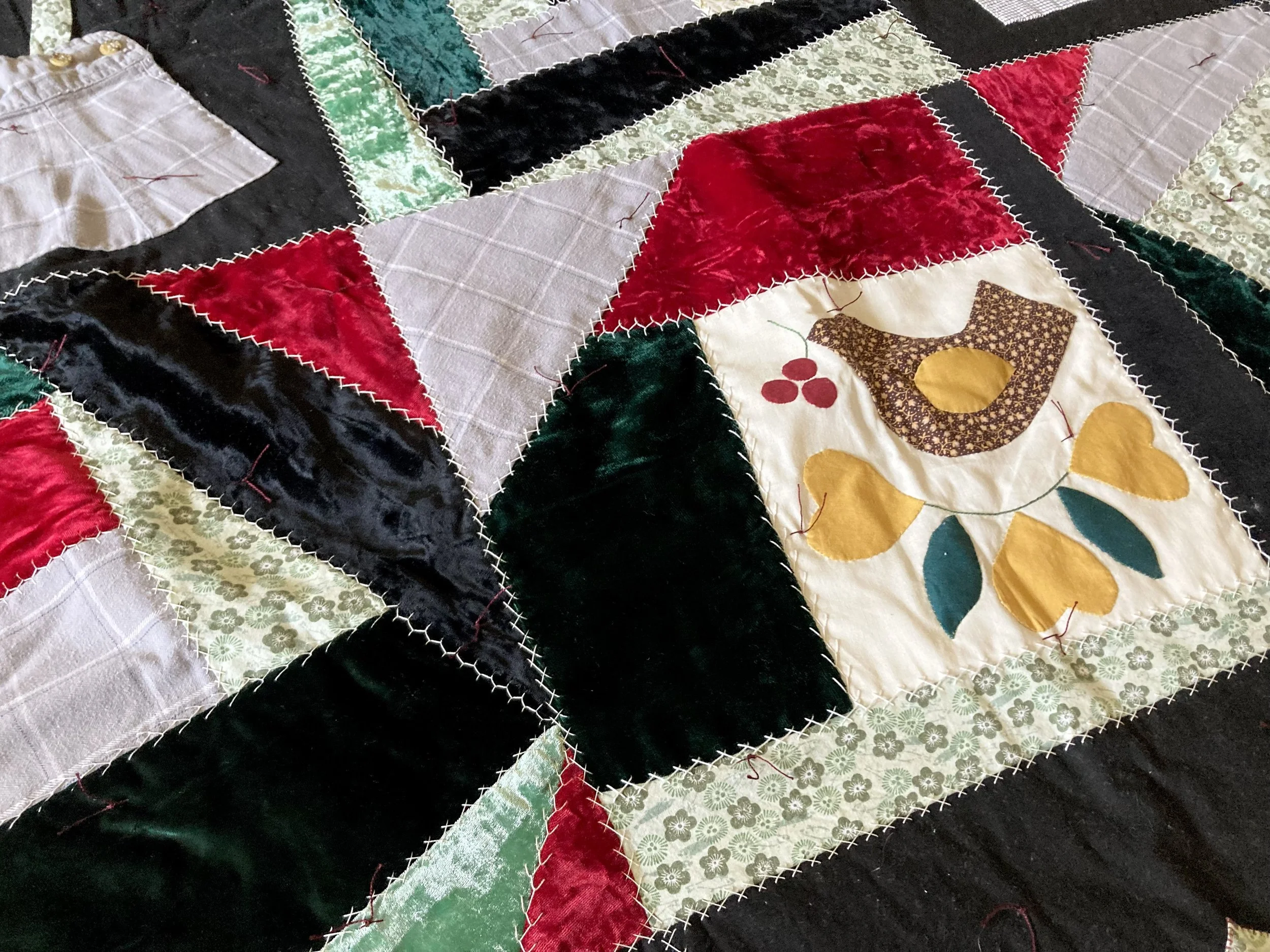 velvet, cotton, wool, and flannel clothing and fabric scraps. grandma’s quilt blocks. cotton embroidery thread.